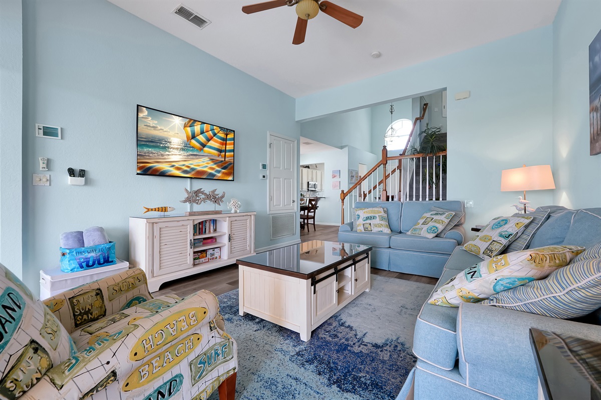 The living room provides ample seating space, and comfort. Watch cable television at your leisure, or connect your own Netflix, Hulu, Amazon Prime accounts to immerse yourself in all of your favorite content. Keep the kids entertained with a selection of movies to choose from. The whole family will enjoy the new 65 inch flat screen TV.