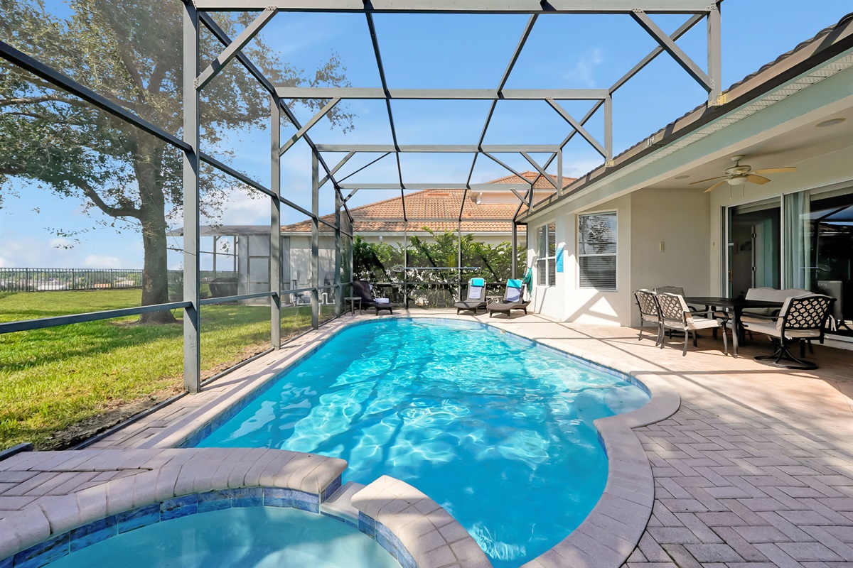 From the living room, there is a large sliding glass door that leads to the screened-in pool area. Sit back and relax on one of the sun-loungers, or enjoy a meal poolside with the outdoor dishes provided. Take a dip in the pool or enjoy the spa as you enjoy beautiful sunsets and the most private atmosphere available in all of the resort homes. During the day you can either enjoy the shaded area, or the afternoon has warm sunshine in the deck.