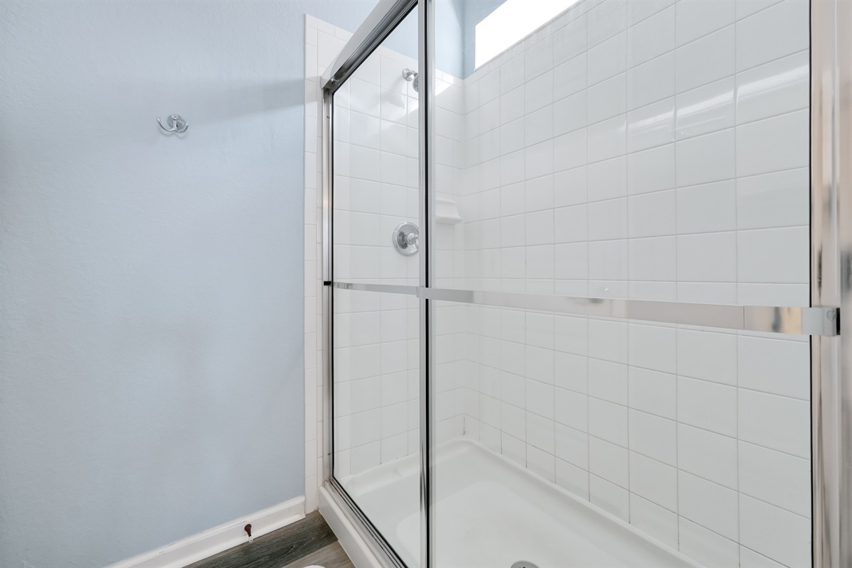 The third bedroom on the main floor has a king size bed and the attached bathroom has dual door access for the bedroom, as well as the guests in the main area.